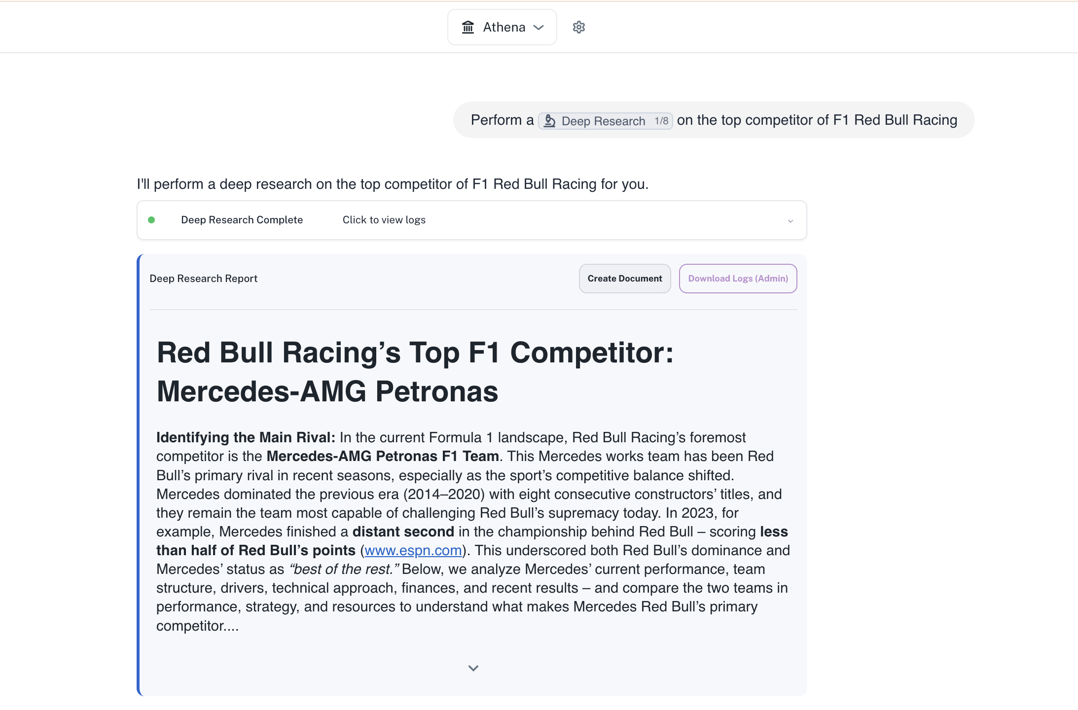 Once the Deep Research is complete, click on “Create Document” button to create an executive report on the Deep Research.