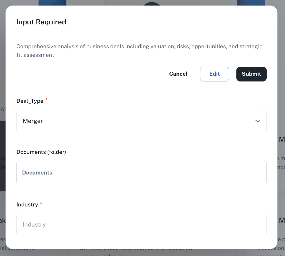 Go to the Library page and select the AOP you wish to run. Fill in all the required inputs for the deal analysis.