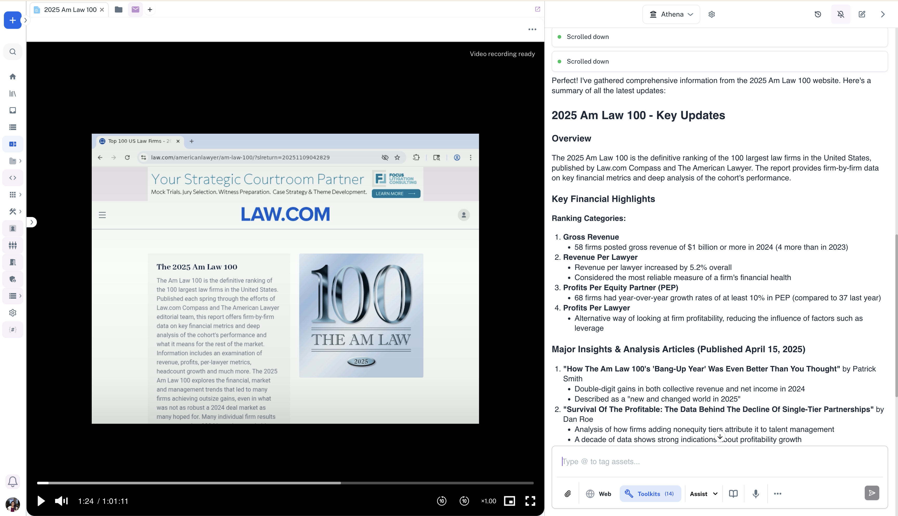 Watch Athena navigate to the official Am Law 100 website and gather latest information.