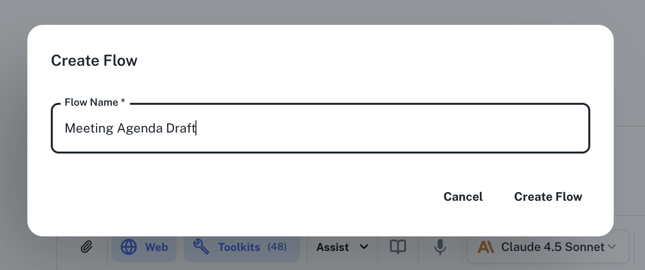 Go to Spaces. Click on the + -> Workflow -> Flow button on the top left and name your flow “Meeting Agenda Draft”.