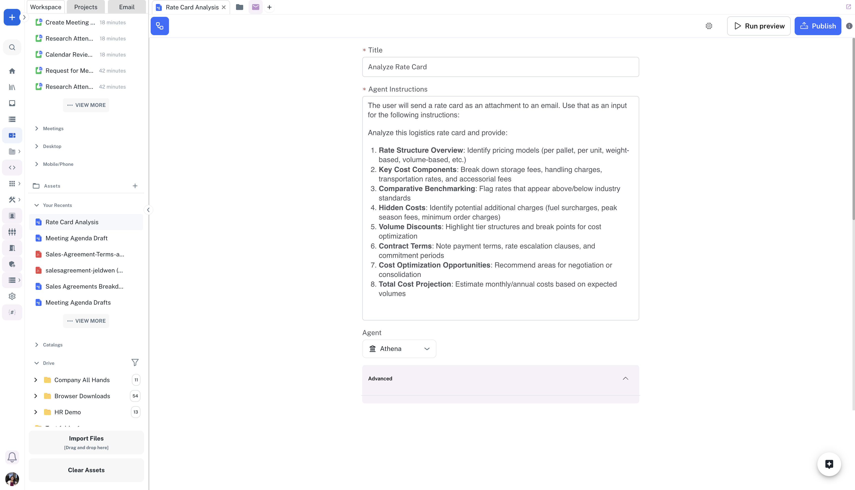 You can click on Publish on the top-right of the flow to trigger the flow on an event. Click on Run this flow on a schedule -> Create new email address. Create a new email slug for your flow, for example rate-card-analysis@agent.athenaintel.com and click on Create.